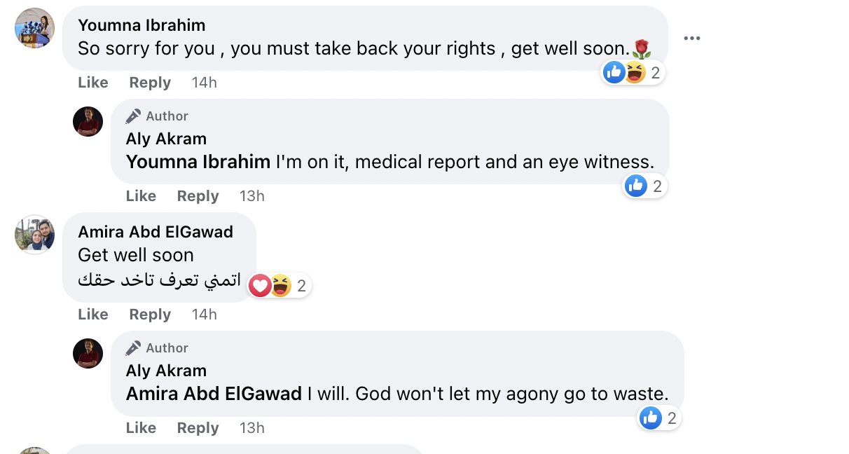 وتفاعل عدد كبير مع المنشور حيث أوضح أكرم في التعليقات أنه جاري عمل تقرير طبي بإصاباته وتحرير محضر رسمي لاسترداد حقه ـ علي حد وصفه ـ.