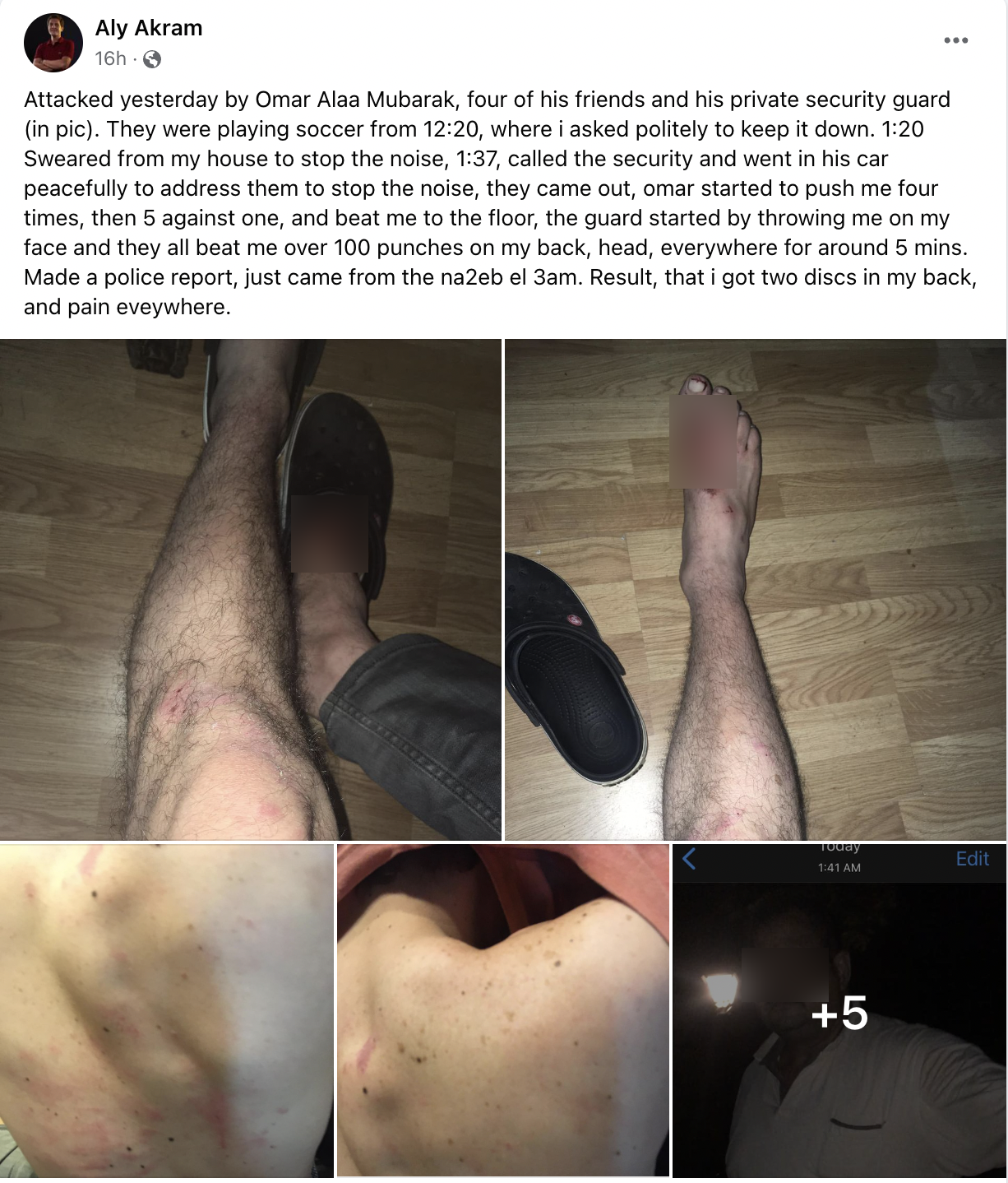 وكتب علي أكرم تفاصيل ما حدث معه باللغة الإنجليزية عبر حسابه علي موقع التواصل الاجتماعي “فيس بوك” قائلا: “تعرضت للهجوم بالأمس من قبل عمر علاء مبارك وأربعة من أصدقائه وحارسه الشخصي، كما تشاهدون في الصور ومقاطع الفيديو التي صورتها، حيث كانوا يلعبون كرة القدم من الساعة 12:20، وطلبت بأدب إبقاء أصواتهم منخفضة في حدود الساعة 1:20، ليتعهدوا بإيقاف الضوضاء”.