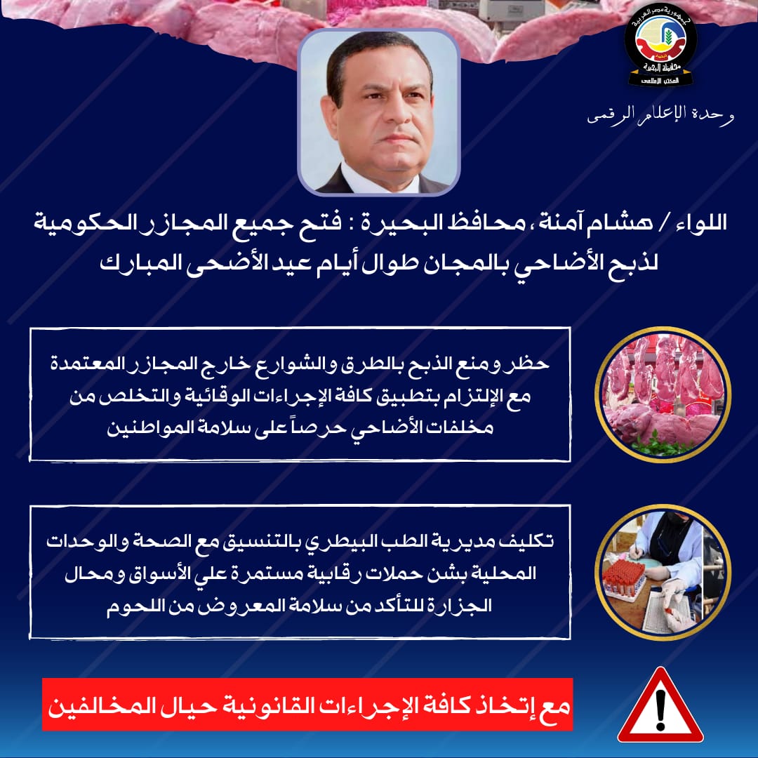 أصدر اللواء هشام آمنة – محافظ البحيرة تعليماته لمديرية الطب البيطري برفع درجة الاستعداد القصوى واستمرار تواجد فريق العمل بغرفة العمليات طوال أيام عيد الأضحى المبارك، لتلقى أية شكاوى او حالات اشتباه بأى أمراض أو مخالفات خاصة باللحوم المعروضة، بمحلات الجزارة والأسواق واتخاذ الإجراءات الفورية بشأنها.
