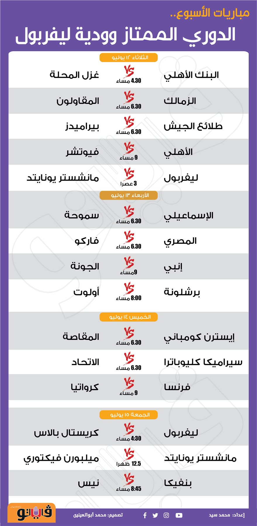 مباريات الأسبوع.. الدوري الممتاز وودية ليفربول| إنفوجراف الجمعة 08/يوليو/2022 - 09:51 م 7/8/2022 9:51:45 PM الأهلي وفيوتشر محمد سيد شارك طباعة 18 حجم الخط شارك طباعة ليفربول الأهلي الدوري الممتاز مانشستر يونايتد بيراميدز الدوري المصري الاسماعيلي الزمالك