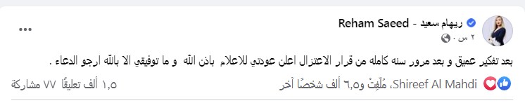 وقالت ريهام سعيد على صفحتها الشخصية بـ"فيس بوك": "بعد تفكير عميق وبعد مرور سنة كاملة من قرار الاعتزال أعلن عودتي للإعلام بإذن الله وما توفيقي إلا بالله ارجو الدعاء".