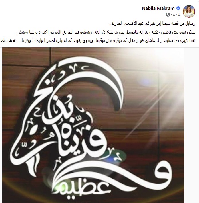 وأرفقت السفيرة نبيلة مكرم بوستها بآية قرآنية من سورة الصافات "وفديناه بذبح عظيم".