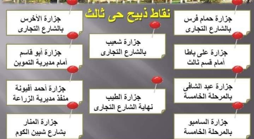 وأكد المحافظ أنه تم الاتفاق بالإشراف على الشوادر يوم الذبح فقط، حيث يتم الكشف على الحيوان الحي والذبح داخل نقاط الذبيح المنتشرة بالمحافظة وعددهم ( ٥ نقطة ذبيح بحي أول، و١٢ نقطة ذبيح بحي ثان، و١٠ نقطة ذبيح بحي ثالث ) وتحت إشراف طبي كامل كما تم تحديد طبيب بيطري لكل نقطة ذبيح بالمحافظة وكذلك التنسيق مع رؤساء الأحياء الثلاثة لرفع المخلفات دوريًا أولًا بأول.