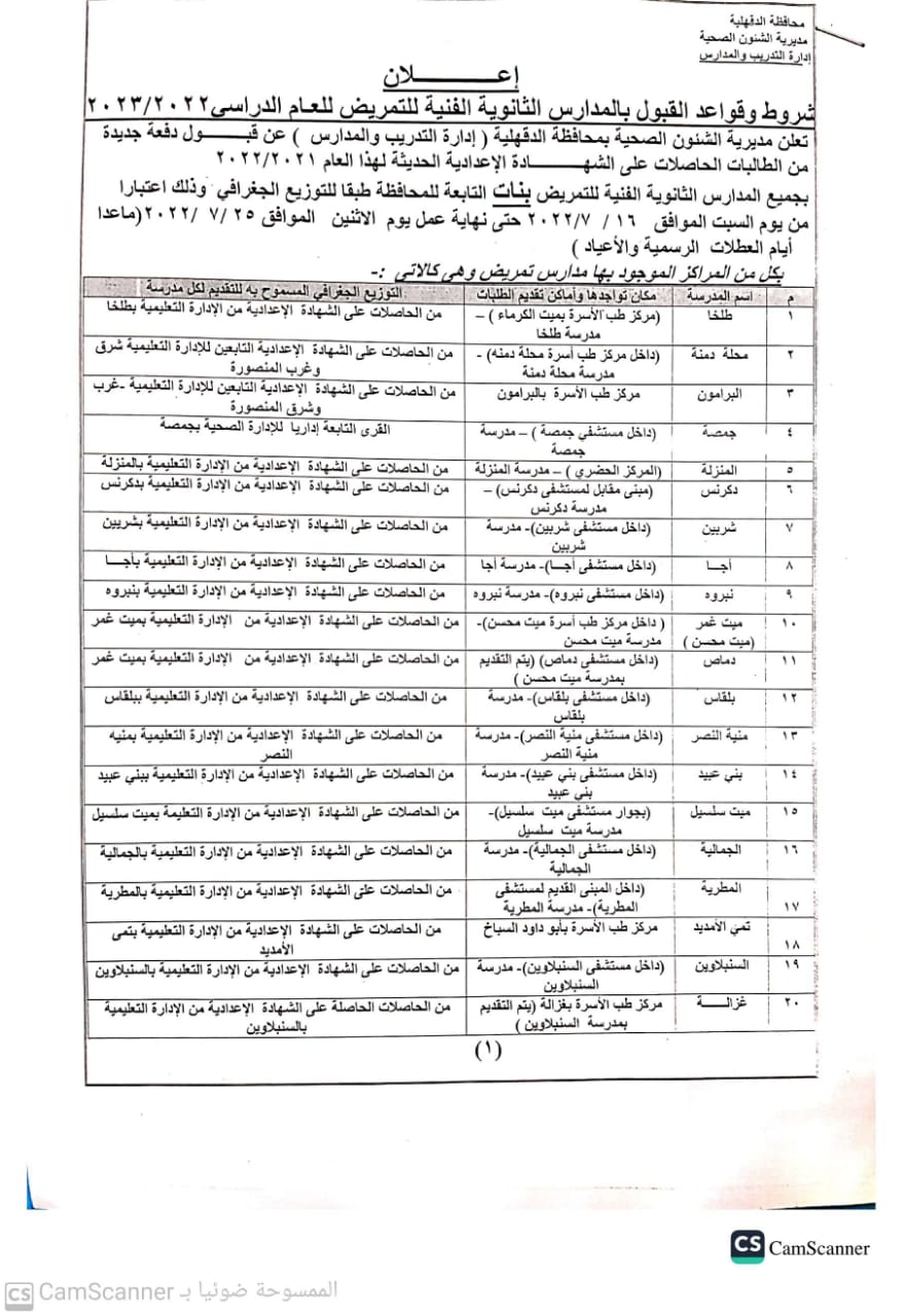 أعلنت مديرية الشئون الصحية بمحافظة الدقهلية عن قبول دفعة جديدة من الطالبات الحاصلات على الشهادة الإعدادية الحديثة لهذا العام 2021-2022 بجميع المدارس الثانوية الفنية للتمريض بنات التابعة لمحافظة الدقهلية وذلك طبقا للتوزيع الجغرافي.