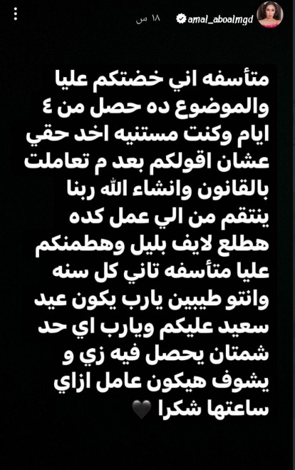 وقالت التيك توكر آمال أبو المجد "متأسفة إني خضتكم عليا والموضوع ده حصل من 5 أيام وكنت مستنيه أخد حقي عشان أقولكم بعد ما تعاملت بالقانون وإن شاء الله ربنا ينتقم من اللي عمل كده، هطلع لايف بالليل وهطمنكم عليا.. متأسفة تاني وكل سنة وانتم طيبين، يارب يكون عيد سعيد عليكم، ويارب اي حد شمتان يحصل فيه زيي ويشوف هيكون عامل ازاي ساعتها".