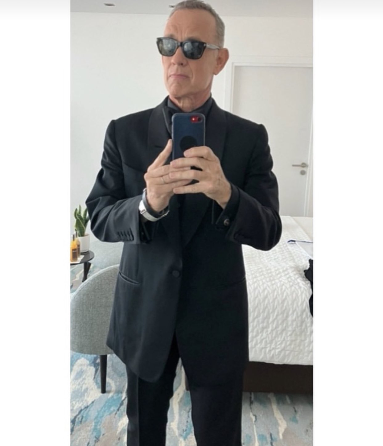 وظهر توم هانكس في الصورة بكامل أناقته، حيث أرتدي بدلة كاملة سوداء اللون ونظارة شمس.