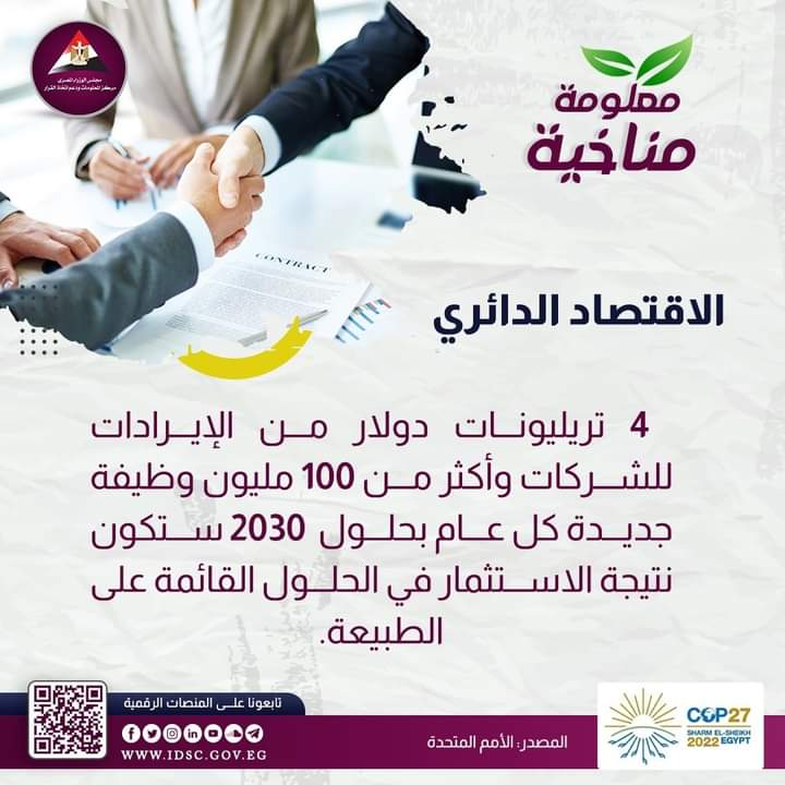 نشر مركز المعلومات ودعم اتخاذ القرار بمجلس الوزراء إنفوجرافًا جديدًا عبر صفحته الرسمية على موقع التواصل الاجتماعي فيسبوك بشأن التحول لاستخدام تقنيات الاقتصاد الدائري.