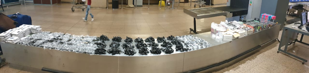 وقام مدير الجمرك، بتكليف أحمد فؤاد حامد مدير الحركة المشرف على الصالة، ومحمود عبد المولي مأمور الجمرك، بتتبع الراكب وتفتيش حقائبه مما أسفر عن ضبط ٢٤٩ تليفون محمول و١٩٤ بطارية و٢٠٨ شاحن و٤٢٠ سيجارة الكترونية و٤٠٨ عبوات زيت خاص بهذه الشيش و١٧٨ عبوة مستحضرات تجميل.