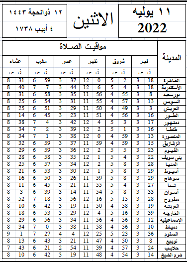 مواقيت الصلاة اليوم وفقًا للتوقيت المحلي لمدينتي القاهرة والإسكندرية وعدد من مدن ومحافظات الجمهورية من واقع بيانات الهيئة العامة للمساحة: