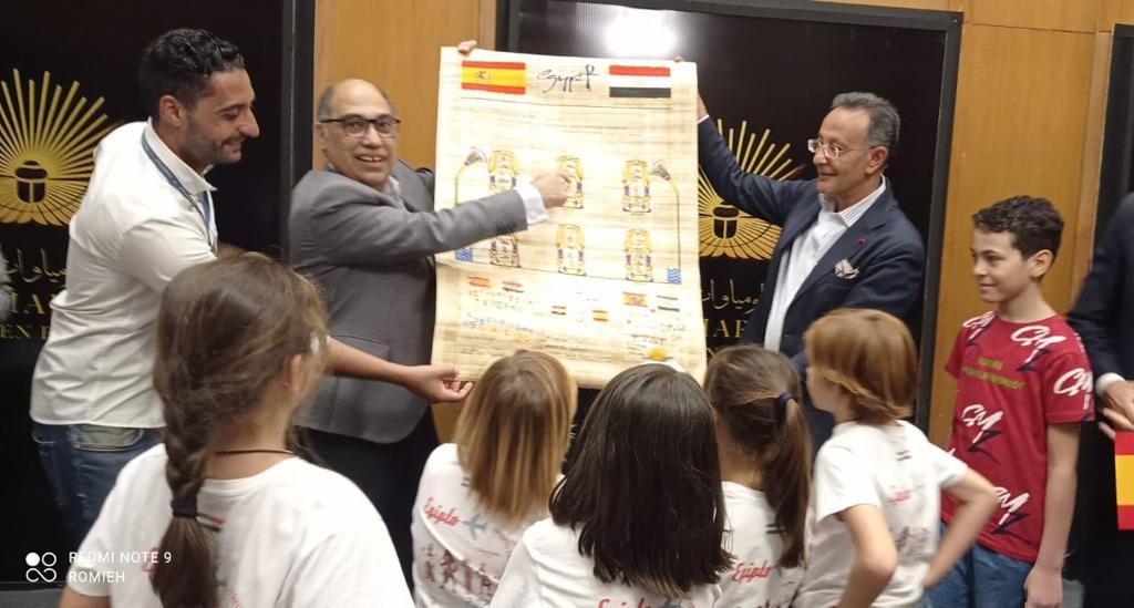 وحرص الدكتور أحمد غنيم الرئيس التنفيذي لهيئة المتحف، وعمرو القاضي الرئيس التنفيذي للهيئة المصرية العامة للتنشيط السياحي، وممثلي السفارة الإسبانية بالقاهرة، وعددًا من الأطفال المصريين علي استقبال الوفد الاسباني، وشاركوا في تصميم بردية تذكارية ترحيبًا بالأطفال الإسبان معربين عن سعادتهم بقدومهم لبلادهم الحبيبة مصر متمنين دوام الصداقة.