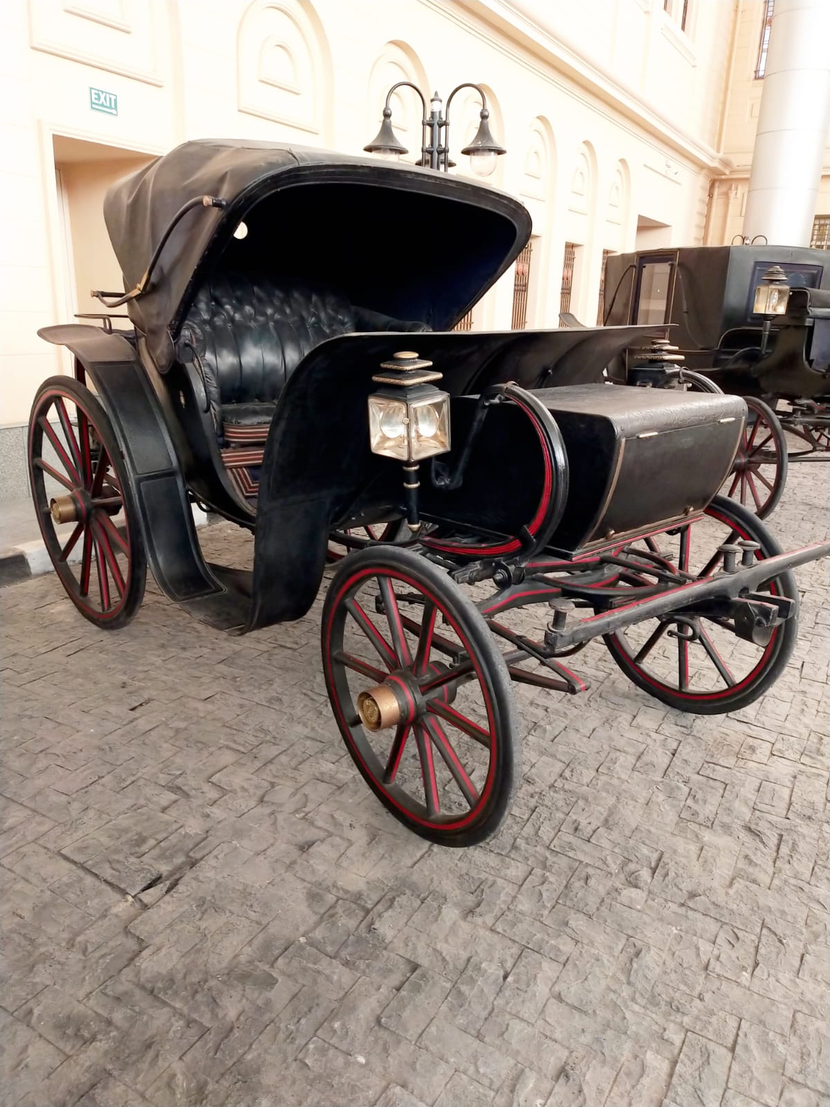 وقال أحمد الصباغ مدير عام المتحف، إن المعرض يضم العربة الدوق وهي عبارة عن عربة مفتوحة بكبوت متحرك مدهون باللون الأسود وبها مقعدين أحدهما داخلي والآخر خلفي ولا يحتوي على كرسي أمامي لسائق العربة وبدلًا منه صندوق خشبي لحفظ أدوات التنظيف الخاصة بالعربة.