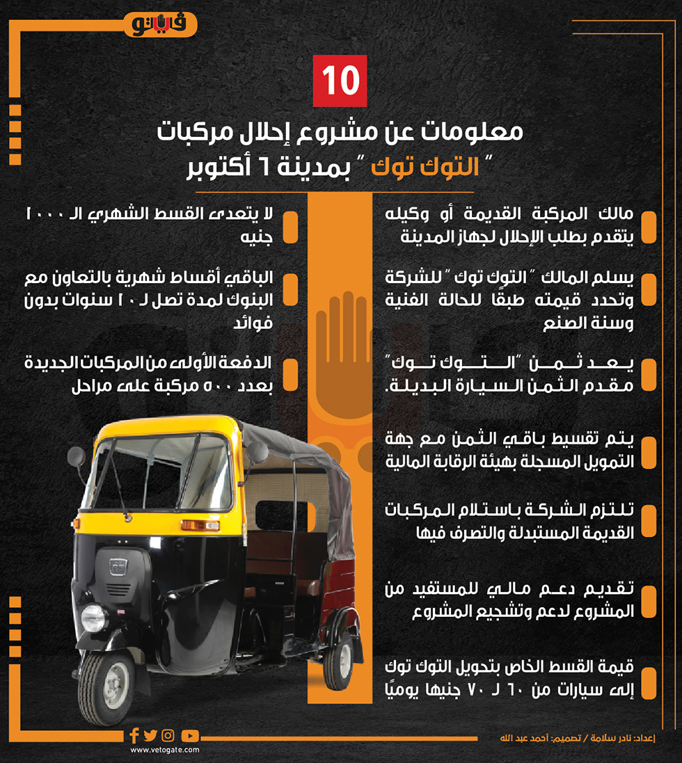 10 معلومات عن مشروع إحلال مركبات " التوك توك " بمدينة 6 أكتوبر | إنفوجراف الإثنين 11/يوليو/2022 - 02:45 م 7/11/2022 2:45:46 PM صورة تكتوك نادر سلامة شارك طباعة 18 حجم الخط شارك طباعة الرقابة المالية هيئة الرقابة المالية جهاز مدينة 6 اكتوبر هيئة الرقابة احلال المركبات