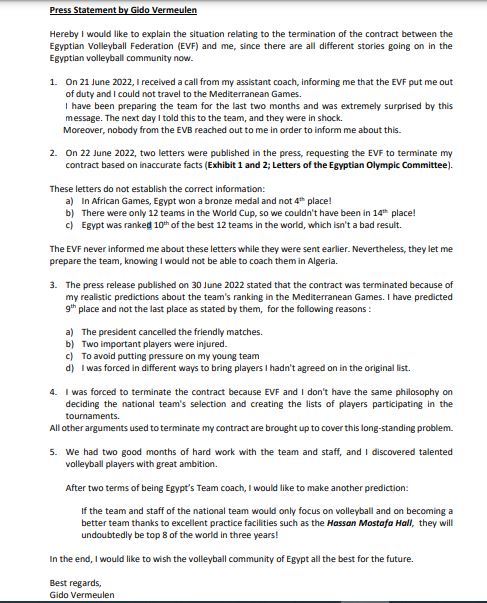 أصدر الهولندي جيدو فيرمولين المدير الفني السابق لمنتخب الكرة الطائرة، بيانا، يكشف من خلاله كواليس صدور قرار من الاتحاد المصري بإقالته، وأيضا تدخل اللجنة الأولمبية ورفض سفره رفقة المنتخب للمشاركة في دورة ألعاب البحر المتوسط بالجزائر.