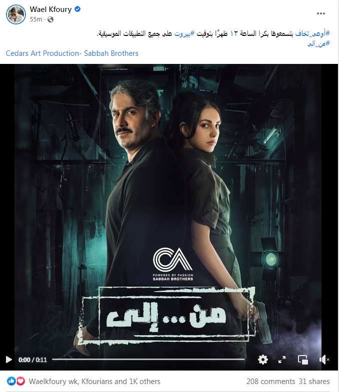 شوق النجم اللبناني وائل كفوري عبر حسابه الشخصي على موقع التواصل الاجتماعي "فيس بوك" جمهوره ومتابعيه بأغنيته الجديدة "أوعى تخاف" من مسلسل "من إلى".