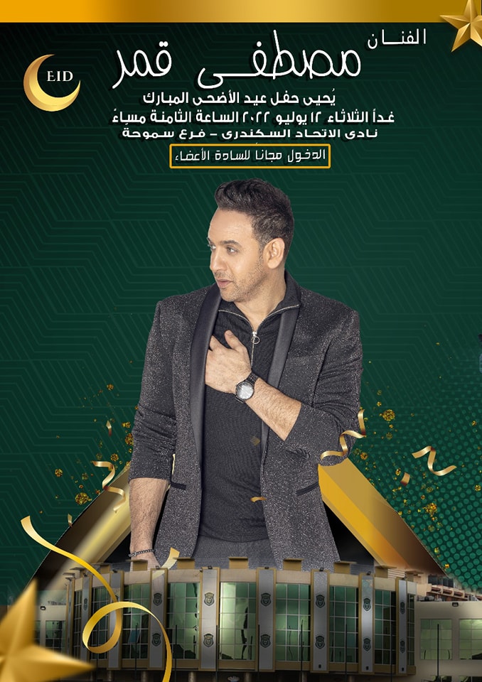 ويقام حفل الفنان مصطفي قمر في الساعة الثامنة مساء بتنظيم مشترك بين اللجنة الاجتماعية ولجنة الشباب بالنادى، غدًا الثلاثاء الموافق 12 يوليو 2022 " رابع أيام عيد الأضحى المبارك " بفرع النادى بسموحة.