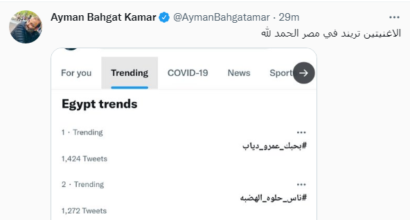 وكتب أيمن بهجت قمر قائلا: "الأغنيتين تريند في مصر الحمد لله".