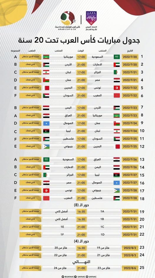 وقبل أسبوعين أجريت قرعة النسخة الثامنة لبطولة كأس العرب للمنتخبات تحت 20 عاما،ً التي ينظمها الاتحاد العربي لكرة القدم، ويستضيفها الاتحاد السعودي لكرة القدم في مدينة أبها، خلال الفترة من 20 يوليو و6 أغسطس 2022.
