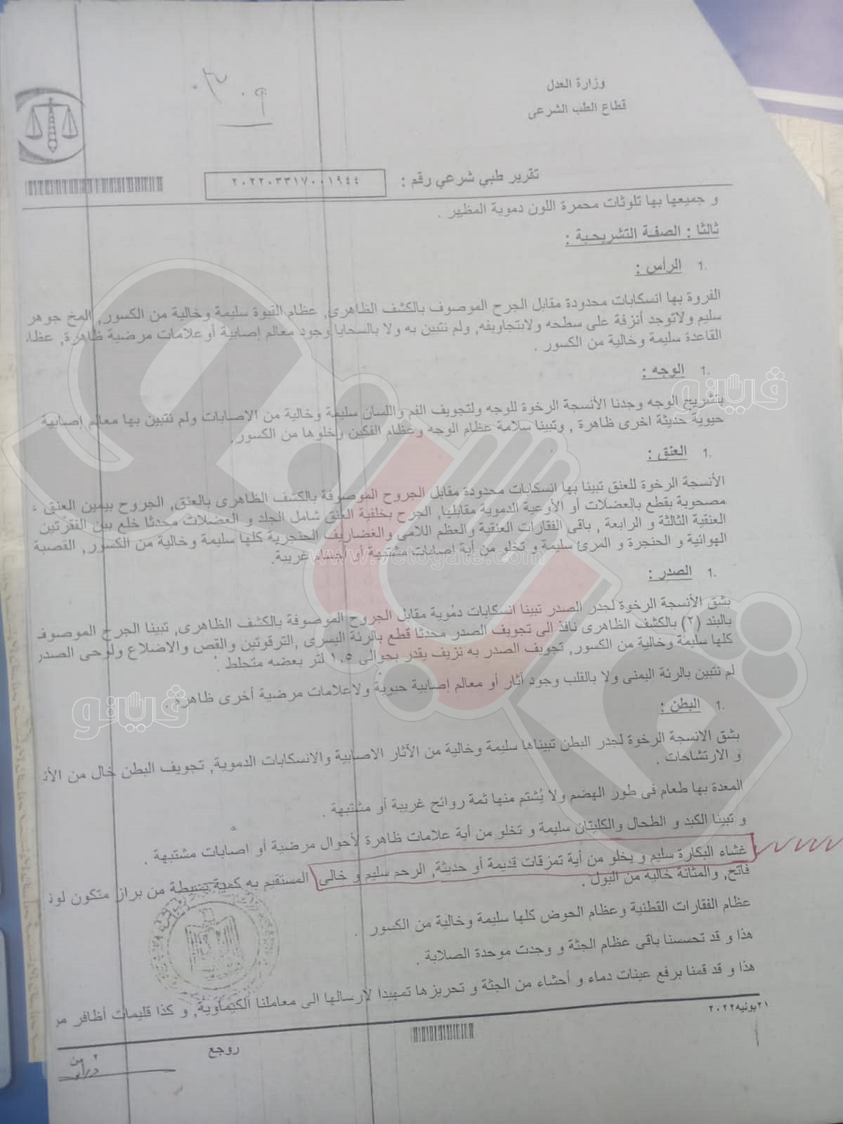 وجاء في تقرير الطب الشرعي التي تنفرد فيتو بنشر صور منه: