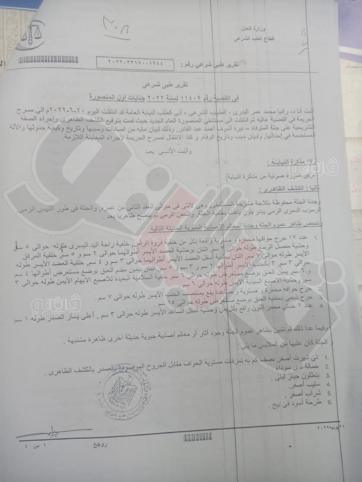 أثبت انا الدكتورة رانيا محمد عمر البدري الطبيب الشرعي اني كطلب النيابة العامة قد انتقلت يوم ٢٠ يونيو ٢٠٢٢ إلي مسرح الجريمة ثم انتقلت إلي مستشفي المنصورة العام الجديد حيث ثم بتوقيع الكشف الظاهري وإجراء الصفة التشريحية علي جثة المتوفاة نيرة أشرف أحمد عبد القادر وذلك لبيان ما به من إصابات وسببها وتاريخها وكيفية حدوثها والآلة المستخدمة في أحداثها ولبيان سبب وتاريخ الوفاة والانتقال لمسرح الجريمة لإجراء المعاينة اللازمة.