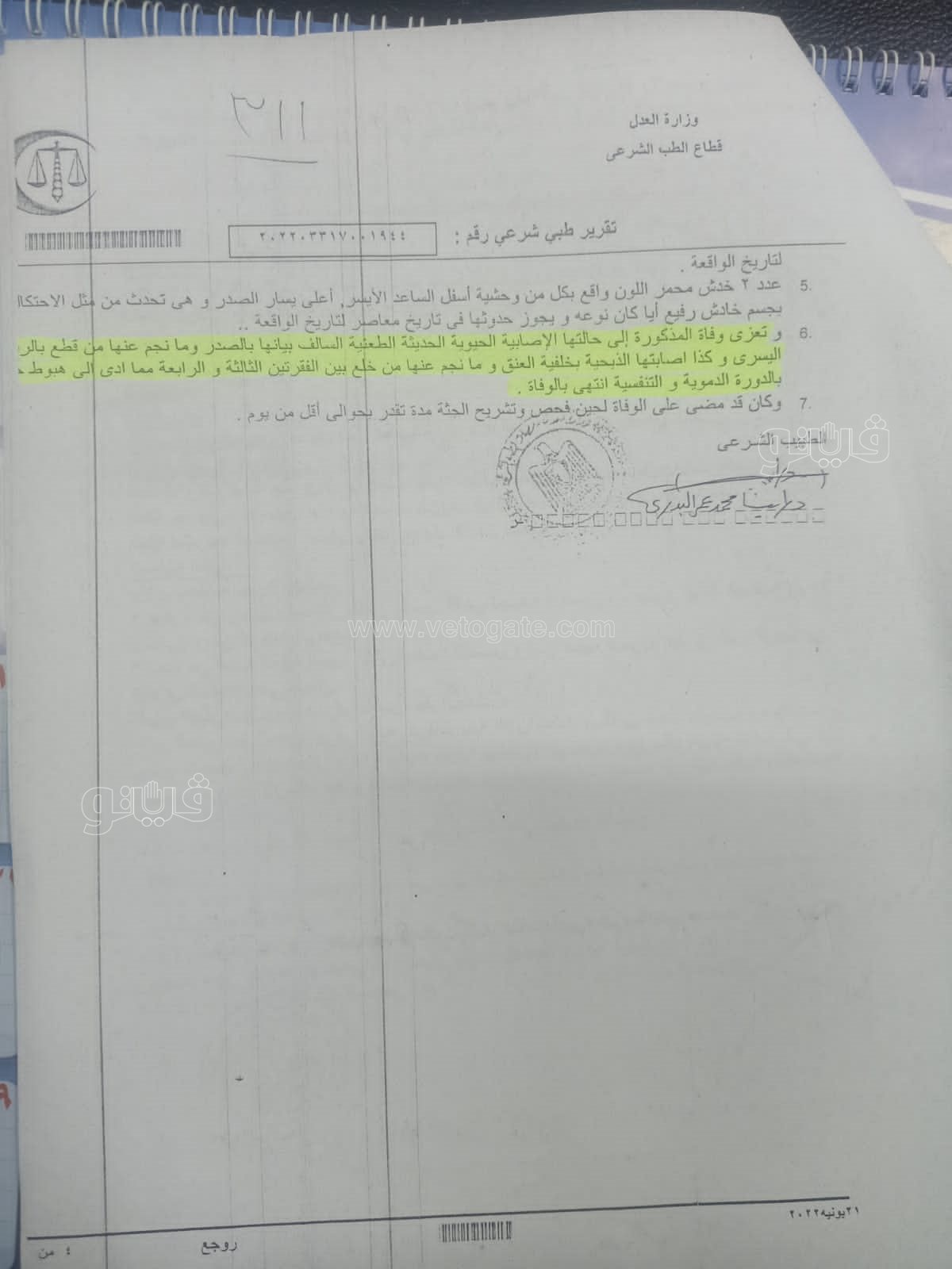 وجاء في تقرير الطب الشرعي التي تنفرد فيتو بنشر صور منه: