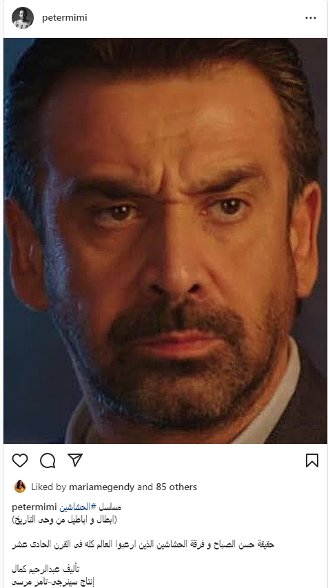 وعلق بيتر ميمي على الصورة: "مسلسل الحشاشين.. (أبطال وأباطيل من وحى التاريخ).. حقيقة حسن الصباح وفرقة الحشاشين الذين أرعبوا العالم كله فى القرن الحادى عشر.. من تأليف عبدالرحيم كمال.. إنتاج سينرجى-تامر مرسى".