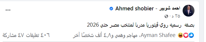 وقال أحمد شوبير عبر حسابه الرسمي على موقع التواصل الاجتماعي "فيس بوك": "بصفة رسمية روي ڤيتوريا مدربًا لمنتخب مصر حتى 2026".
