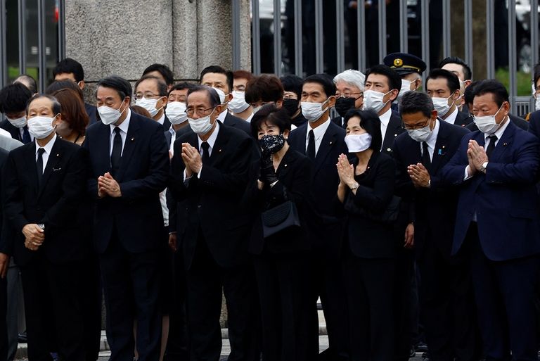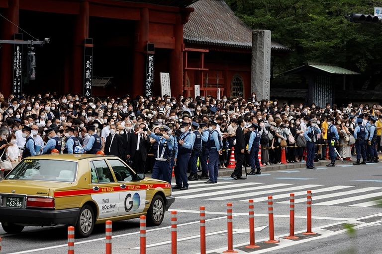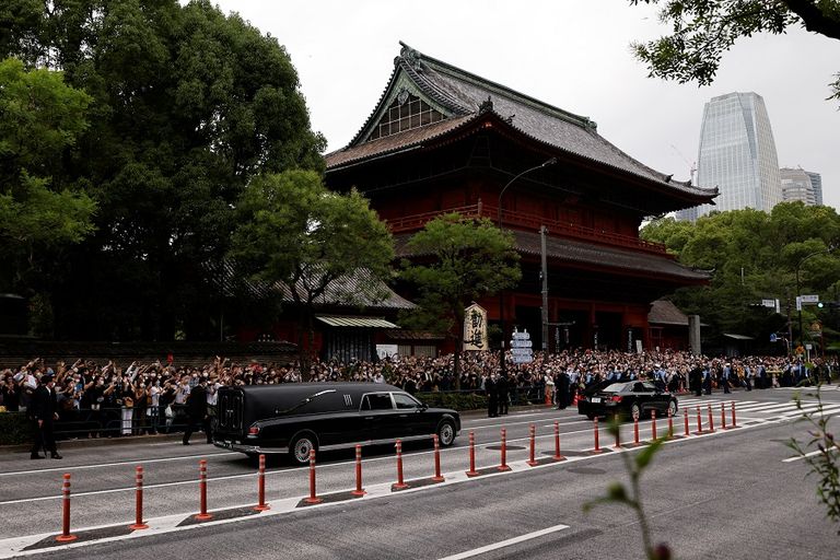 ووسط وجود مكثف للشرطة، دخل رجال يرتدون سترات سوداء ونساء يرتدين ملابس سوداء معبد زوجوجي بوسط طوكيو لحضور مراسم الجنازة الخاصة.