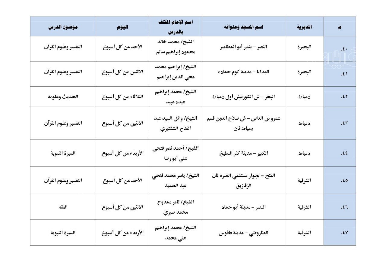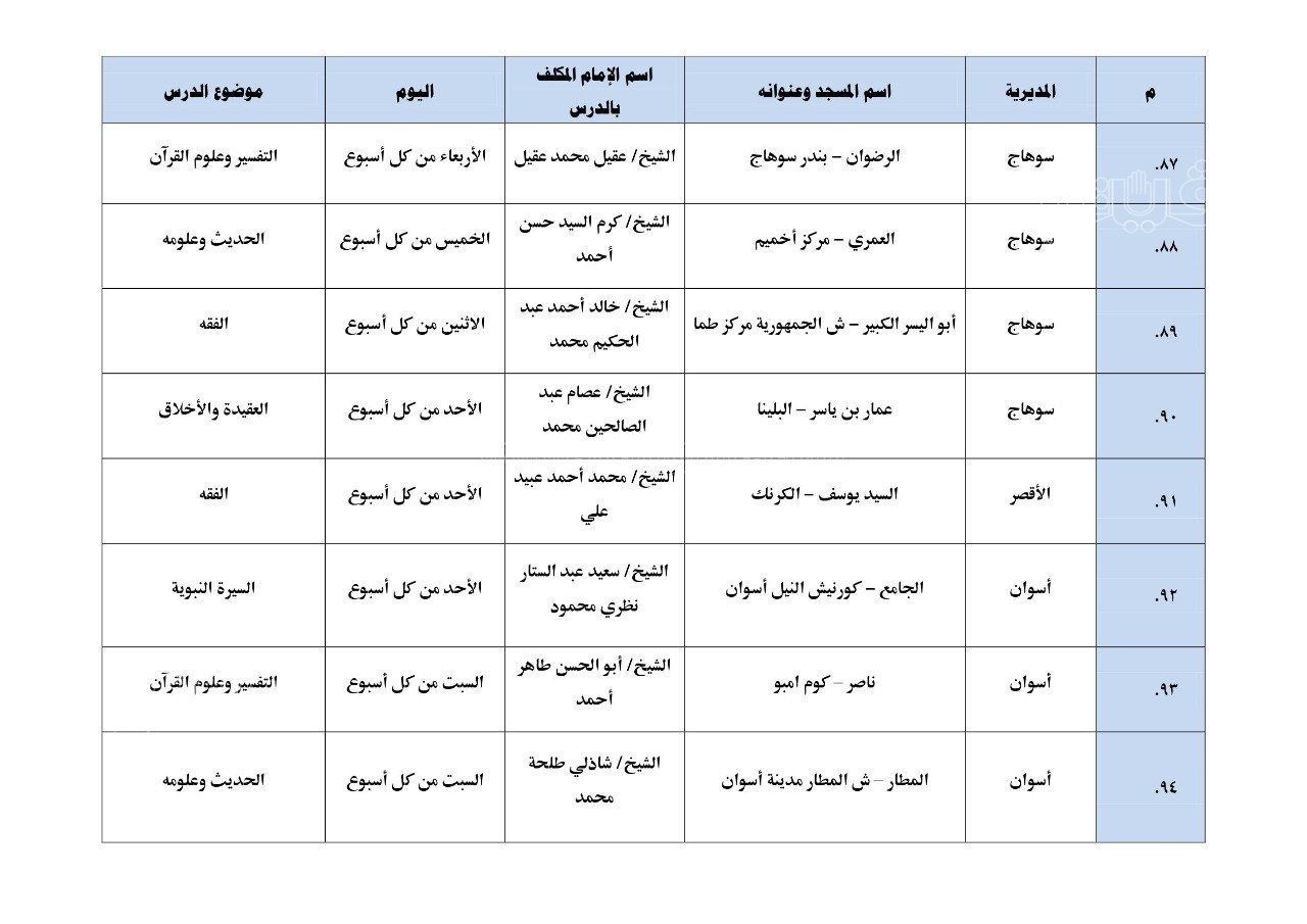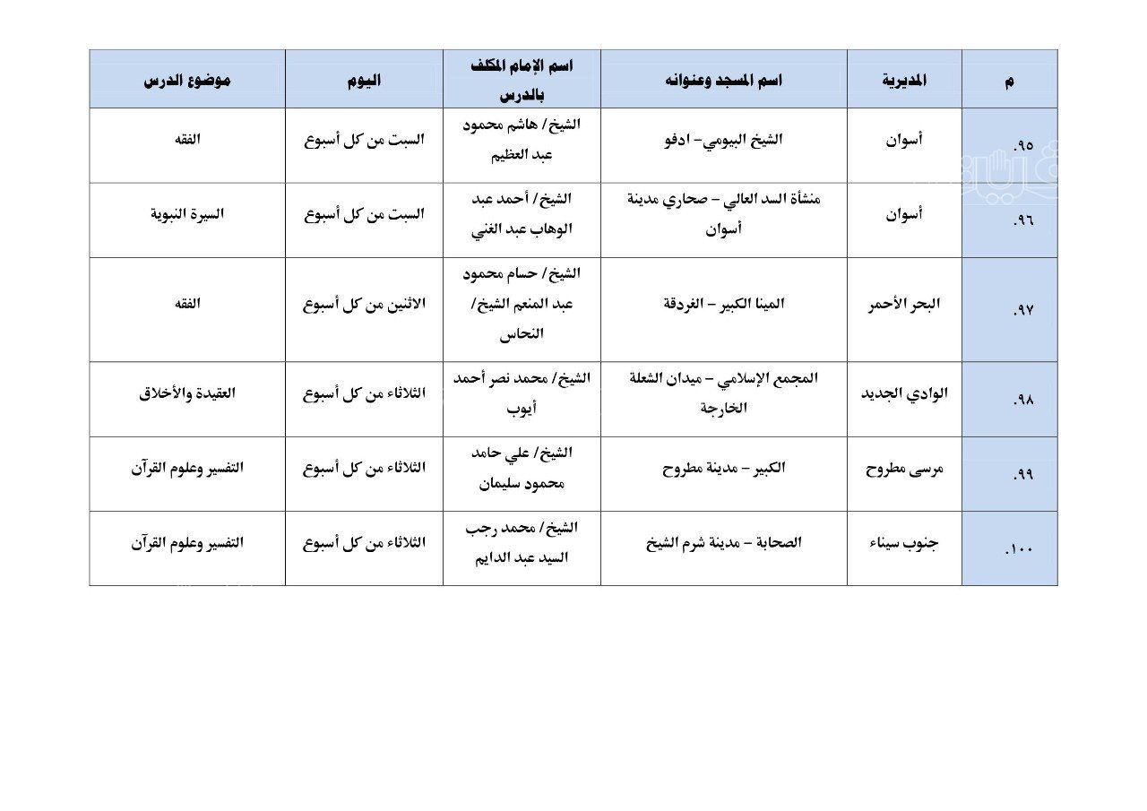 نشرت وزارة الأوقاف بيانًا بأول مائة مسجد تطبق الدروس العلمية والدعوية المنهجية، والتي سيبدأ تطبيقها بدءًا من يوم الأحد المقبل 17 يوليو بين المغرب والعشاء.