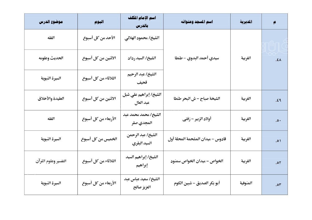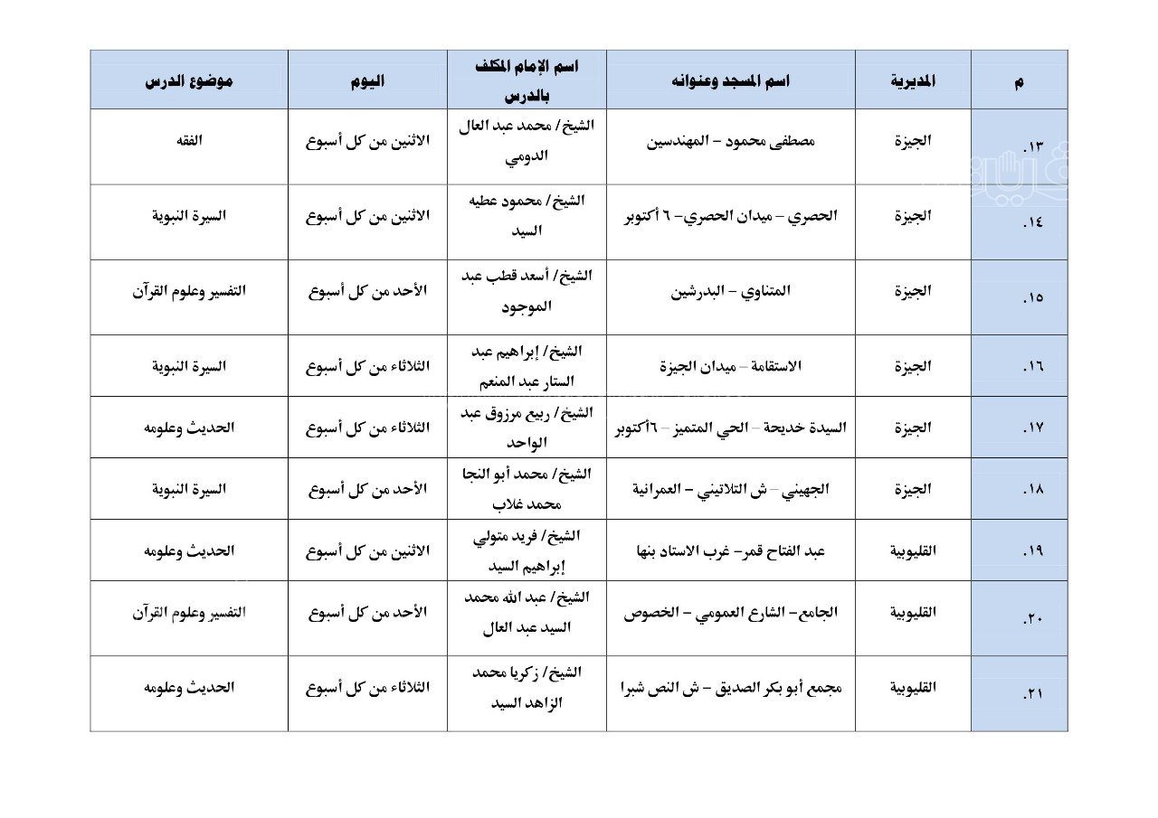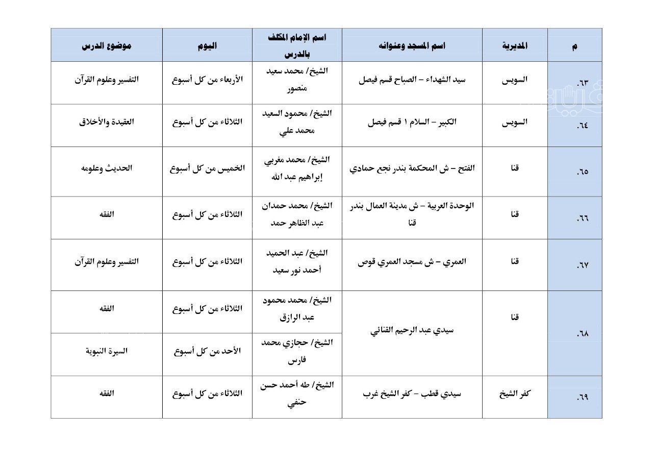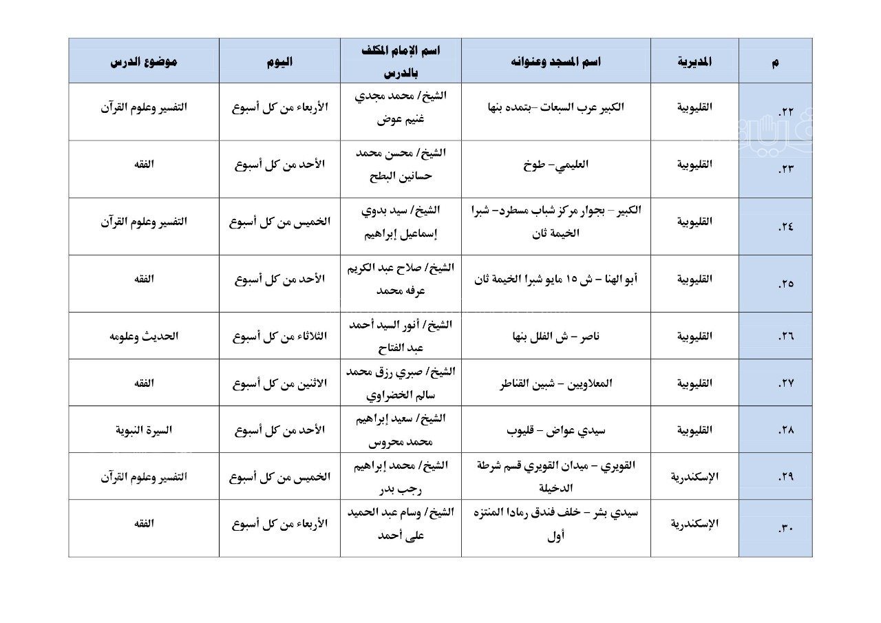 نشرت وزارة الأوقاف بيانًا بأول مائة مسجد تطبق الدروس العلمية والدعوية المنهجية، والتي سيبدأ تطبيقها بدءًا من يوم الأحد المقبل 17 يوليو بين المغرب والعشاء.