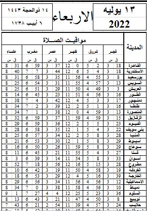 مواقيت الصلاة اليوم وفقًا للتوقيت المحلي لمدينتي القاهرة والإسكندرية وعدد من مدن ومحافظات الجمهورية من واقع بيانات الهيئة العامة للمساحة: