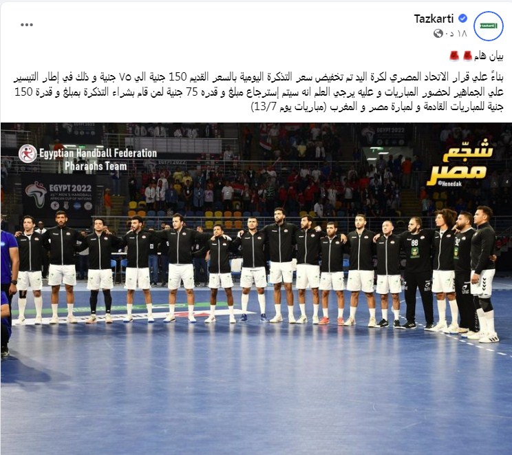وقالت الشركة في بياتها: "بناءً على قرار الاتحاد المصري لكرة اليد تم تخفيض سعر التذكرة اليومية بالسعر القديم 150 جنيهًا إلى 75 جنيهًا، وذلك في إطار التيسير على الجماهير لحضور المباريات، وعليه يرجى العلم أنه سيتم استرجاع مبلغ وقدره 75 جنيهًا لمَن قام بشراء التذكرة بمبلغ وقدره 150 جنيهًا للمباريات القادمة ولمبارة مصر والمغرب (مباريات يوم 13/7).
