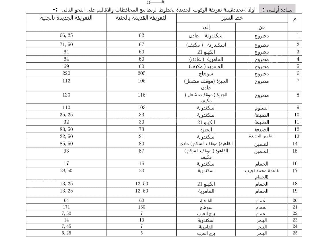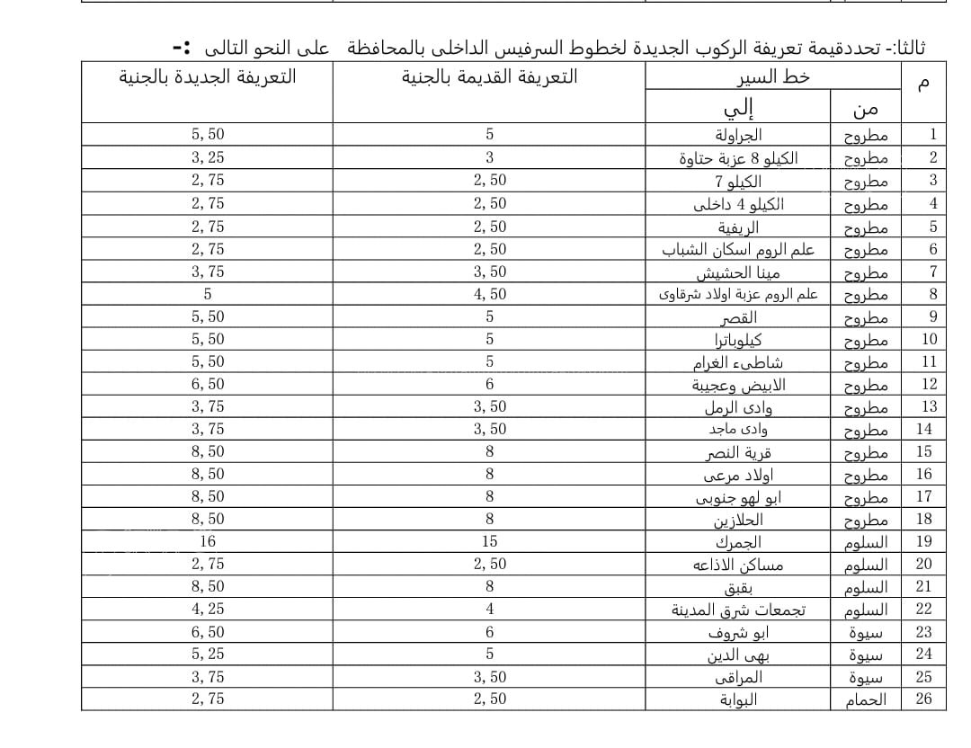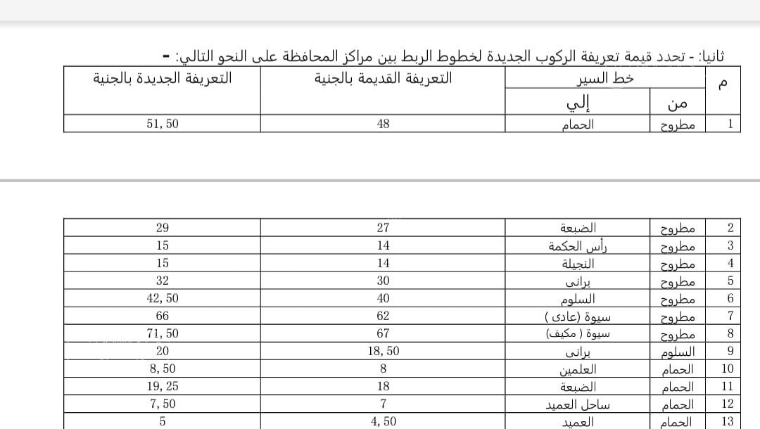 وتنشر “فيتو” تعريفة الركوب الجديدة بمواقف وسيارات وخطوط السير الداخلية والخارجية بمحافظة مطروح.
