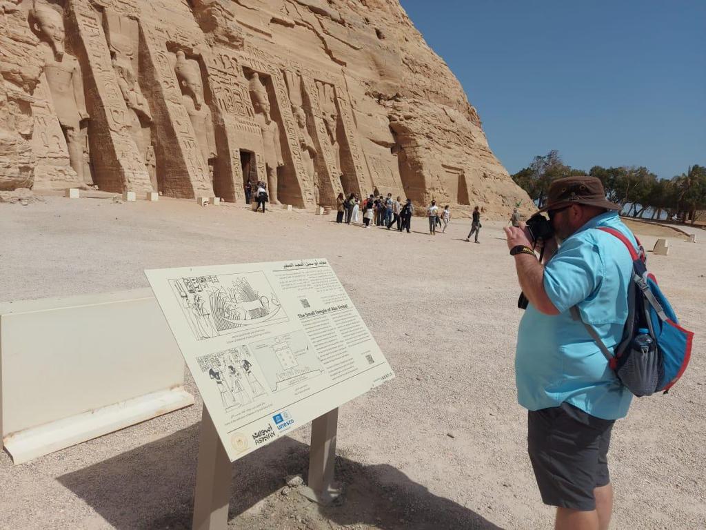 وأضاف أن المعابد المسجلة علي قائمة التراث العالمي لليونسكو تم تزويدها بلوحات بها معلومات وصور أرشيفية ورسوم توضيحية عن مشروع إنقاذها خلال ستينات القرن الماضي ومراحل التوثيق والفك والنقل والتركيب في مواقعها الحالية، وتم إتاحة هذه المواقع لذوي الهمم لتشجيع السياحة الميسرة، حيث تم توفير مسارات للحركة لمستخدمي الكراسي المتحركة ولوحات شارحة بطريقة برايل، هذا بالإضافة إلي الاهتمام بتحسين الخدمات المصاحبة للزيارة من توفير أماكن لاستراحة الزائرين مزودة بمقاعد ومظلات وسلات بنظام فصل القمامة.