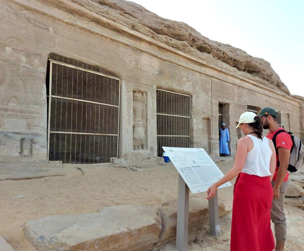 وأضافت أن المشروع شمل وضع عدد من اللافتات الإرشادية بالطرق المؤدية لتلك المواقع والمتاحف تم تنفيذها بالتنسيق مع المحافظة، كما تم تزويدها بالخرائط التي تسلط الضوء على المواقع السياحية والأثرية في مصر بصفة عامة ومحافظة أسوان بصفة خاصة، كما تم تحديد وتهيئة مسارات الزيارة وموقع مكاتب التذاكر وتزويدها بلوحات منفذة بالكود الموحد مثل سياسة الزيارة والمواعيد وأسعار التذاكر وكذلك الرقم الساخن للشكاوى والمقترحات (19546)، ولوحات للاتجاهات تيسيرًا على الزائرين لسهولة التحول داخل الموقع الأثري أو المتحف، فضلا عن تهيئة ساحات الانتظار بأبو سمبل وكوم أمبو لاستقبال سيارات الزائرين والأتوبيسات السياحية.