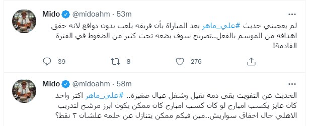 وتابع: "لم يعجبني حديث #علي_ماهر بعد المباراة بأن فريقه يلعب بدون دوافع لانه حقق اهدافه من الموسم بالفعل..تصريح سوف يضعه تحت كثير من الضغوط في الفترة القادمة!"