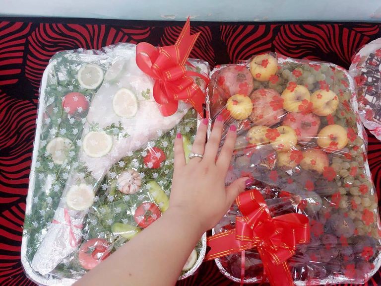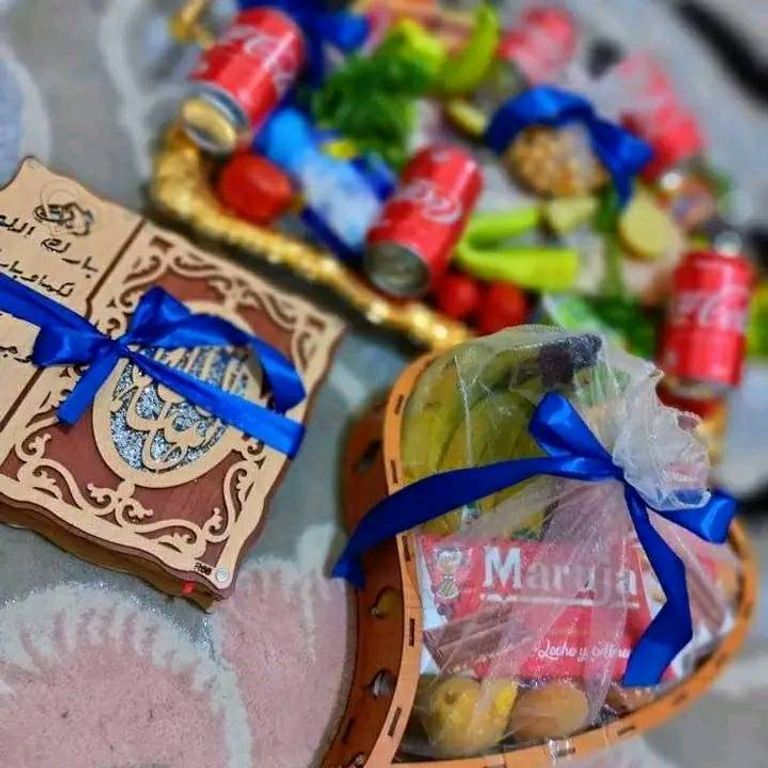 وذكرت أنها كانت عبارة "قُفة" مملوءة بالحناء والمواد الغذائية مثل السكر والزيت والقهوة وبعض الفواكه، مع قطعة قماش تصنع منها فستانًا تقليديًّا.