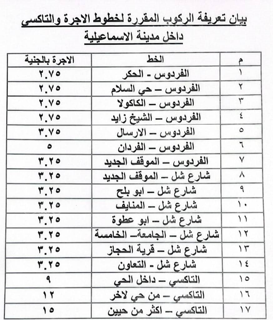 اعتمد اللواء شريف فهمي بشارة محافظ الإسماعيلية، اليوم الأربعاء، بيان تعريفة الركوب المُقررة لخطوطِ الأُجرة والسرفيس والتاكسي داخل مدينة الإسماعيلية، بعد الزيادة في أسعار البنزين والسولار، وذلك بناءً على ما انتهت إليه اللجنة العُليا للمرور والمواقف بالمحافظة بتاريخ ١٣ يوليو ٢٠٢٢، برئاسة المهندس أحمد عصام الدين نائب المحافظ.