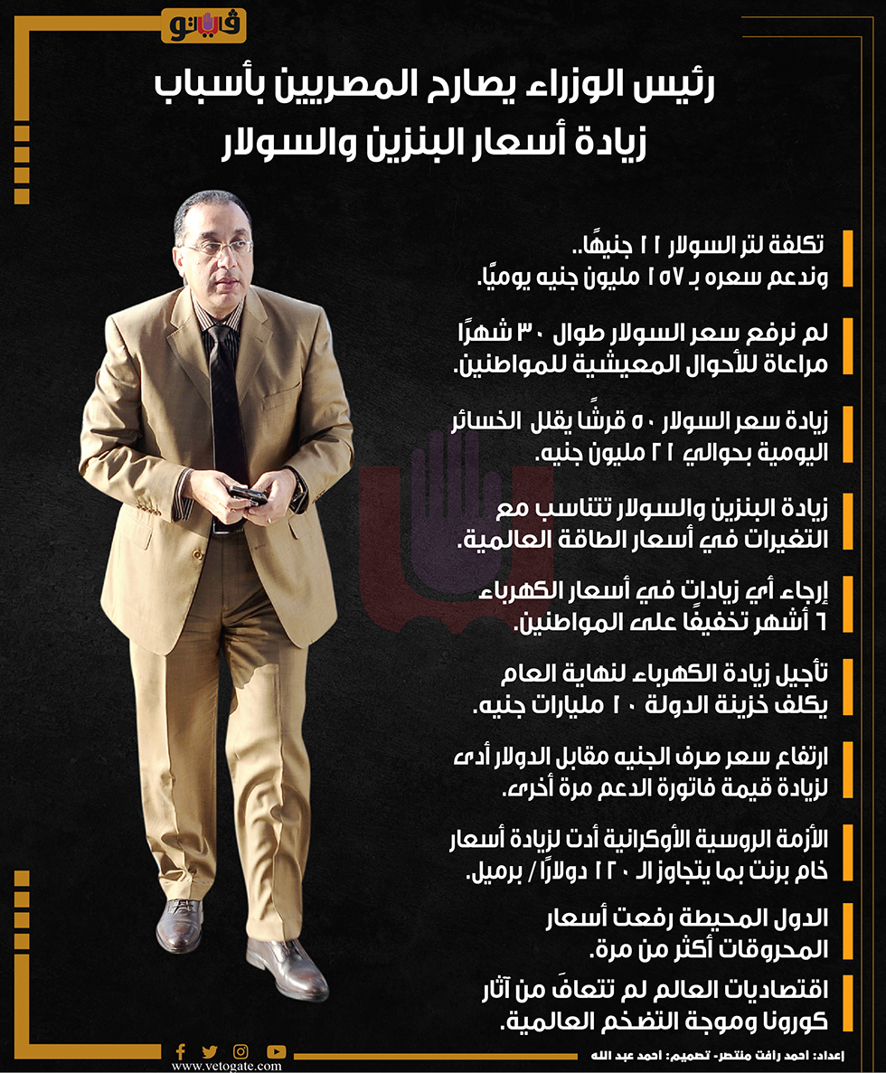 رئيس الوزراء يصارح المصريين بأسباب زيادة أسعار البنزين والسولار | إنفوجراف الأربعاء 13/يوليو/2022 - 08:39 م 7/13/2022 8:39:48 PM تصريحات رئيس الوزراء أحمد رأفت منتصر شارك طباعة 18 حجم الخط شارك طباعة رئيس الوزراء اسعار البنزين والسولار زيادة اسعار البنزين زيادة أسعار البنزين والسولار