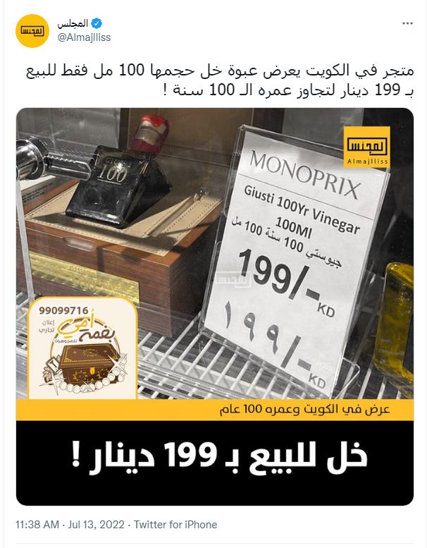 بسعر باهظ.. عبوة خل عمرها 100 عام تثير الجدل بالكويت