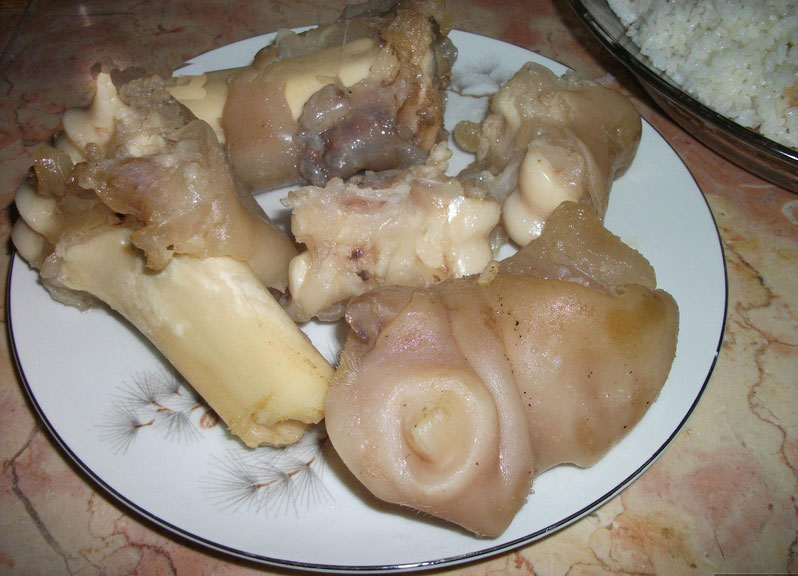 -نضيف الكارع في الماء وقت تسخين الماء وبعد ذلك نخرجه علي صينيه ونأتي بسكين صغير حامي وننزع الشعر بعكس اتجاه الشعرايه رايح جاي رايح جاي حتي ينظف الكارع والأماكن التي بها شعر صغير لاصق ولم تصل له الحرارة نضعه مرة أخرى في المياه الساخنة ونستمر في هذه العمليه حتي ننضف جميع قطع الكوارع الموجوده.