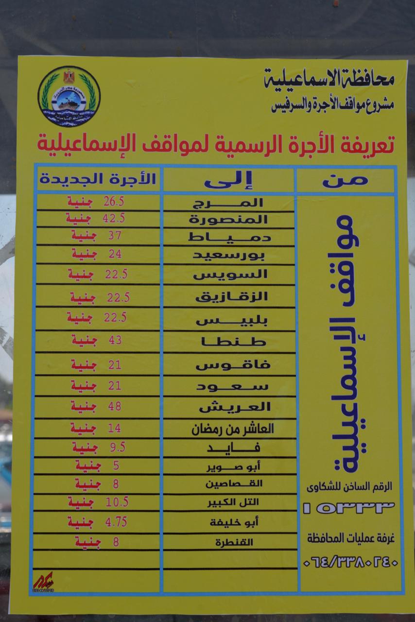 وكان اللواء شريف فهمي بشارة محافظ الإسماعيلية، قد أصدر أمس الأربعاء، القرار رقم ٥٠١ لسنة ٢٠٢٢، الذي تضمن زيادة تعريفة ركوب السيارات الأجرة العاملة على الخطوط الداخلية والخارجية بين مراكز المحافظة بعضها البعض وبينها وبين المحافظات الأُخرى بنسب تتراوح بين ٥ ٪ إلى ٧ ٪ و ذلك بعد اعتماد بيان تعريفة الركوب المُقررة لسيارات الأُجرة والسرفيس بنطاق محافظة الإسماعيلية، الذي انتهت إليه اللجنة العليا للمرور والمواقف برئاسة المهندس أحمد عصام الدين نائب محافظ الإسماعيلية.