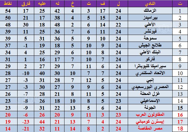 جدول ترتيب الدوري المصري الممتاز بعد الجولة الـ 24