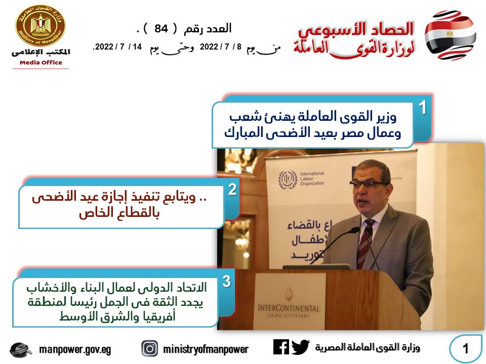 وفيما يلي تفاصيل ما جاء بالحصاد الأسبوعي، حيث هنأ محمد سعفان، وزير القوي العاملة، شعب وعمال مصر والأمتين العربية والإسلامية، بمناسبة عيد الأضحى المبارك، داعيا الله أن يجعله عيد خير على مصرنا الغالية، وأن يحفظ الله أمتنا من قوى الشر المتربصين بنا .