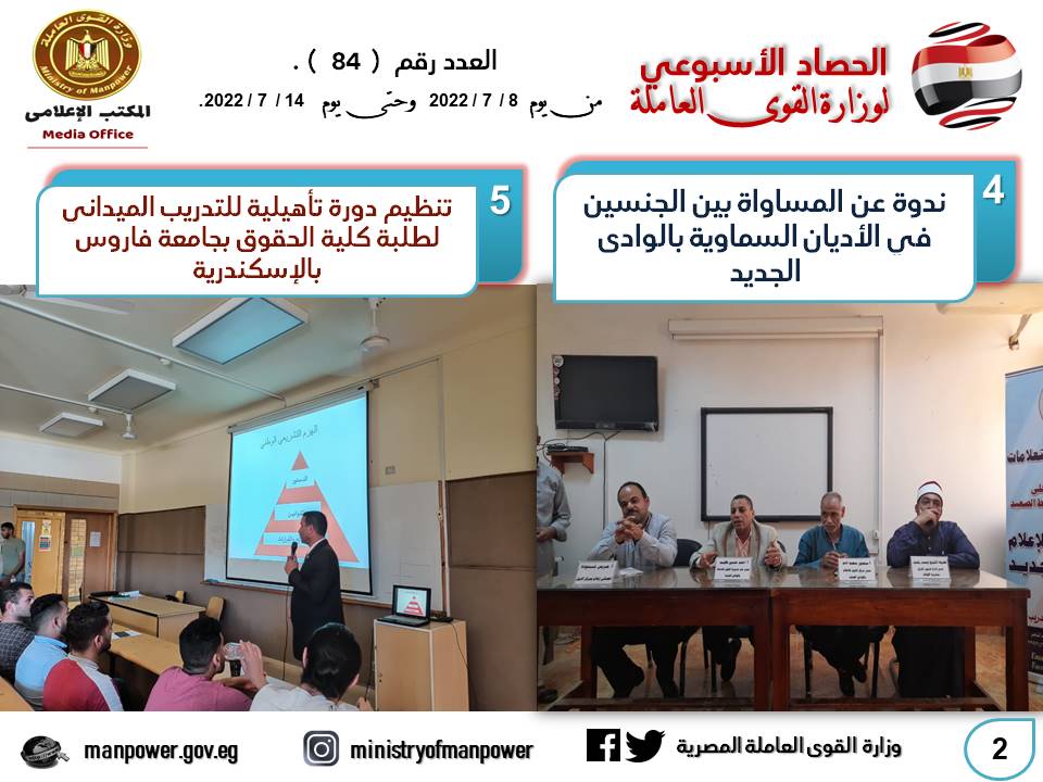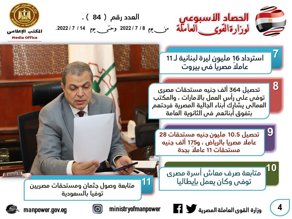 شهد حصاد الأسبوع الحالي، في وزارة القوى العاملة العديد من الأحداث المهمة خلال الفترة من 8 إلى 14 يوليو 2022، حيث هنأ وزير القوي العاملة شعب وعمال مصر بعيد الأضحى المبارك، وتابع تنفيذ إجازة عيد الأضحى بالقطاع الخاص، كما تابع وصول جثمان الصيدلي المقتول بالرياض وأكد أن جميع حقوقه محفوظة، بالاضافة الى استرداد 16 مليون ليرة لبنانية لـ 11 عاملًا مصريًا في بيروت، وتحصيل 364 ألف جنيه مستحقات مصري توفي على رأس العمل بالأمارات، و10 ملايين و716 ألف جنيه مستحقات 39 مصري بالسعودية .