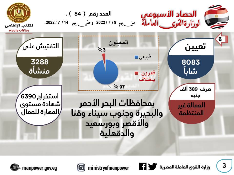 كما شمل حصاد الأسبوع تعيين 8083 شابًا منهم 66 "قادرون باختلاف" في 7 محافظات، وصرف منح للرعاية الاجتماعية والصحية للعمالة غير المنتظمة المسجلة بمديريات القوى العاملة بمحافظة البحر الأحمر، والبحيرة، وجنوب سيناء، وقنا، والأقصر، وبورسعيد، والدقهلية، بلغت 389 ألفًا و470 جنيهًا، والتفتيش على 3288 منشأة لتطبيق أحكام القانون، فضلًا عن إستخراج 6390 شهادة قياس مستوى المهارة، ورخصة مزاولة الحرفة لـ 6390 عاملا.