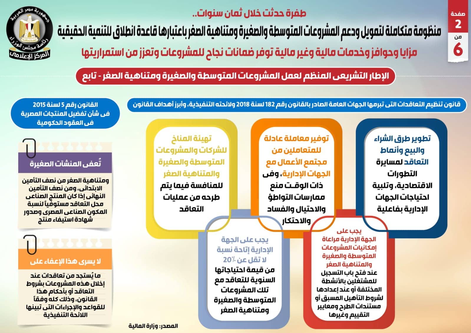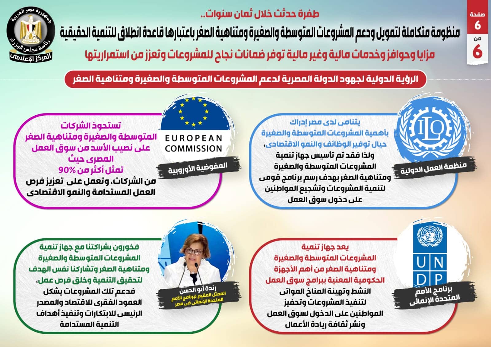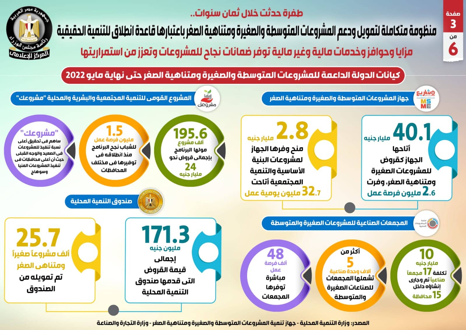 وفي هذا الصدد نشر المركز الإعلامي لمجلس الوزراء تقريرًا تضمن إنفوجرافات تسلط الضوء على جهود الدولة في تمويل ودعم المشروعات المتوسطة والصغيرة ومتناهية الصغر باعتبارها قاعدة انطلاق للتنمية الحقيقية، من خلال منظومة متكاملة تشمل مزايا وحوافز وخدمات مالية وغير مالية بما يوفر ضمانات نجاح لتلك المشروعات ويعزز من استمراريتها، وذلك على مدار السنوات الثماني الماضية.