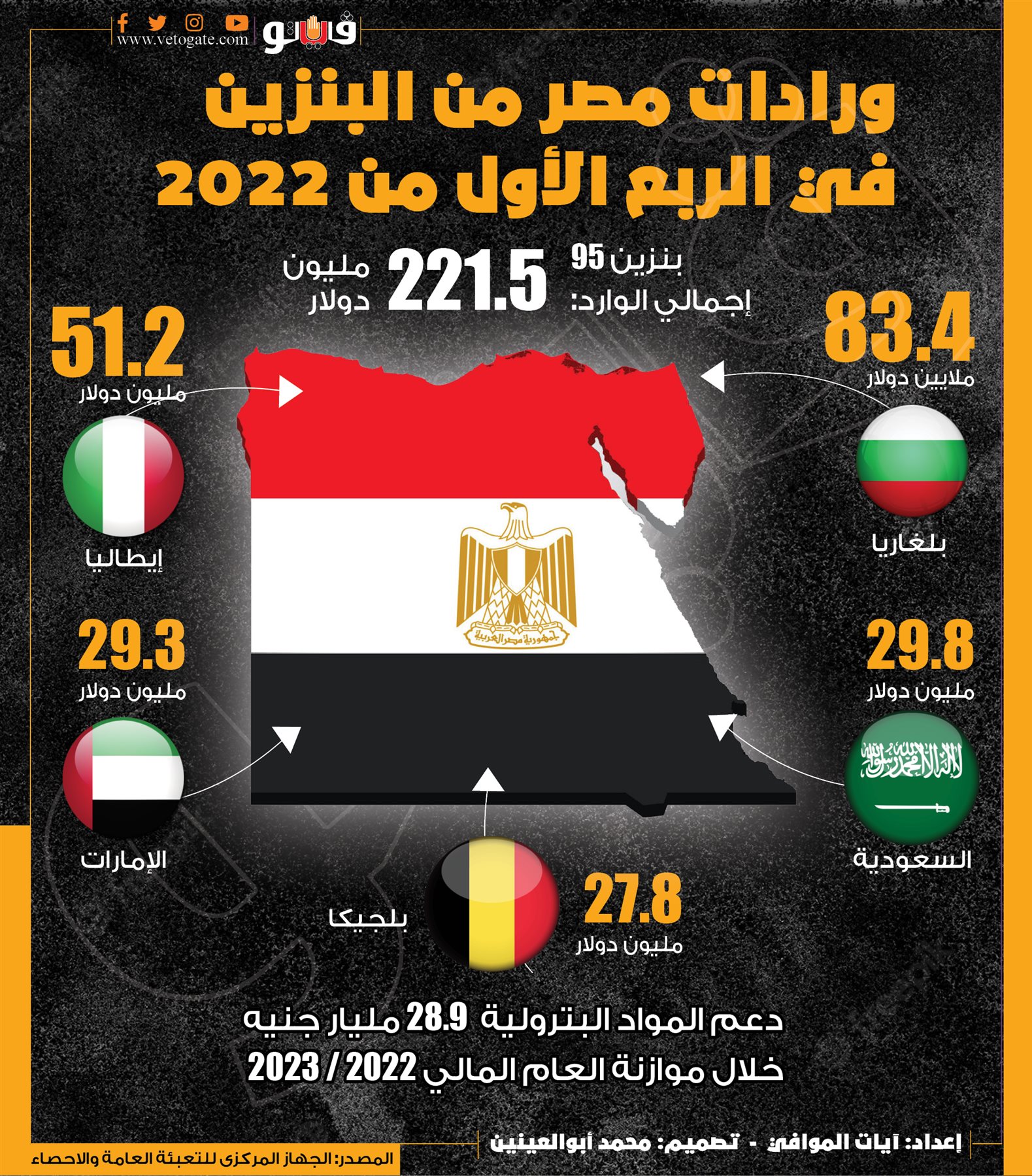 واردات مصر من البنزين في الربع الأول من 2022|إنفوجراف السبت 16/يوليو/2022 - 10:01 ص 7/16/2022 10:01:03 AM صورة ارشيفية آيات الموافى شارك طباعة 18 حجم الخط شارك طباعة الواردات الجهاز المركزى للتعبئة العامة والإحصاء دعم المواد البترولية