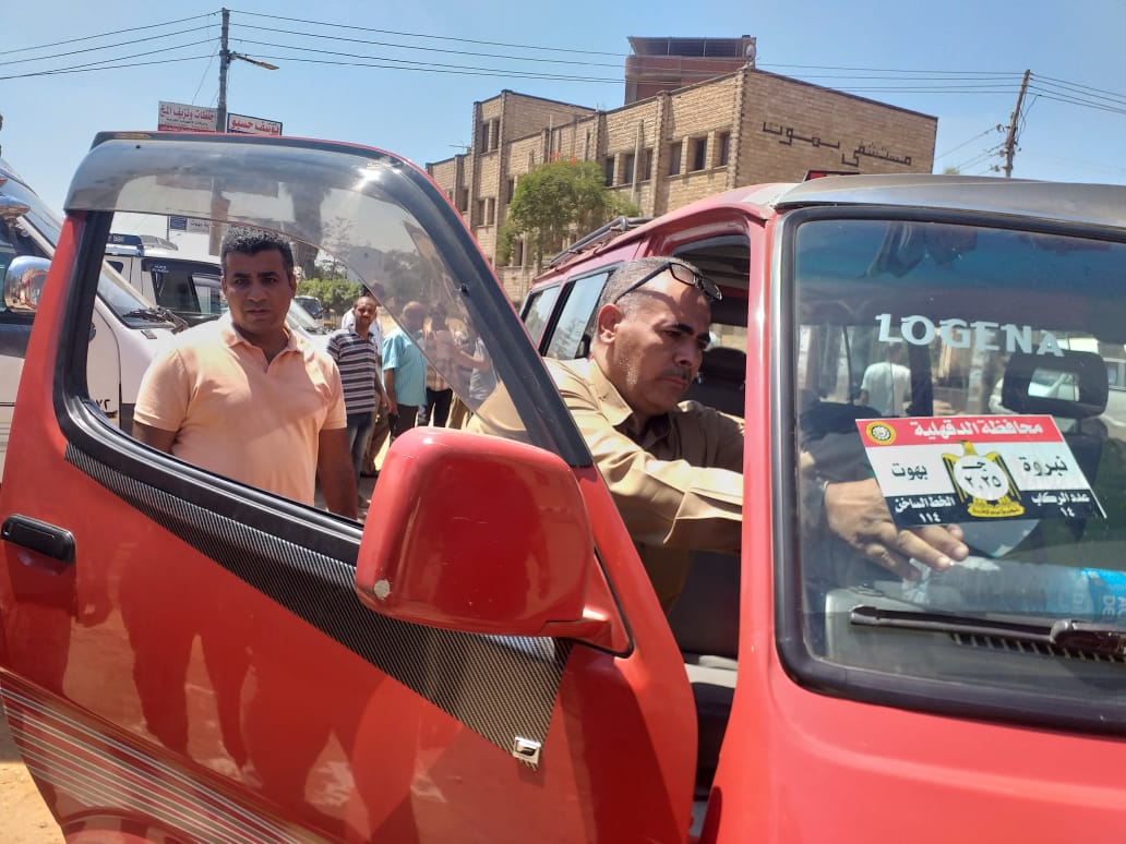 تعليق استيكرات بالأجرة الجديدة على سيارات الميكروباص بالدقهلية | صور