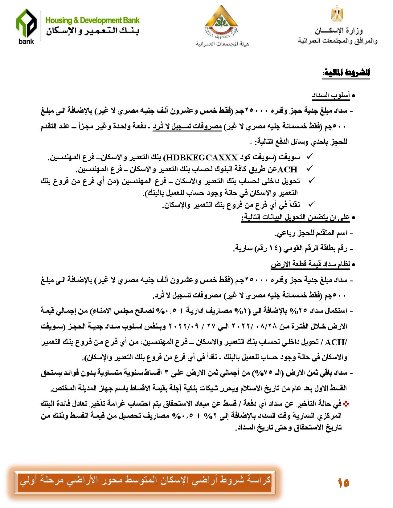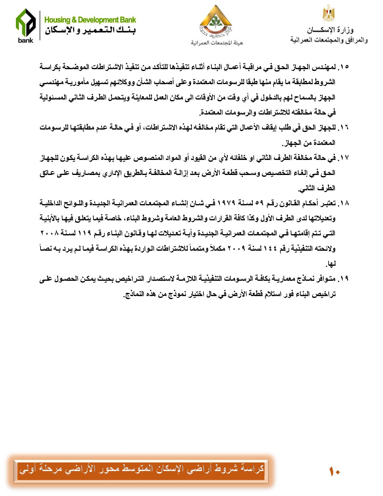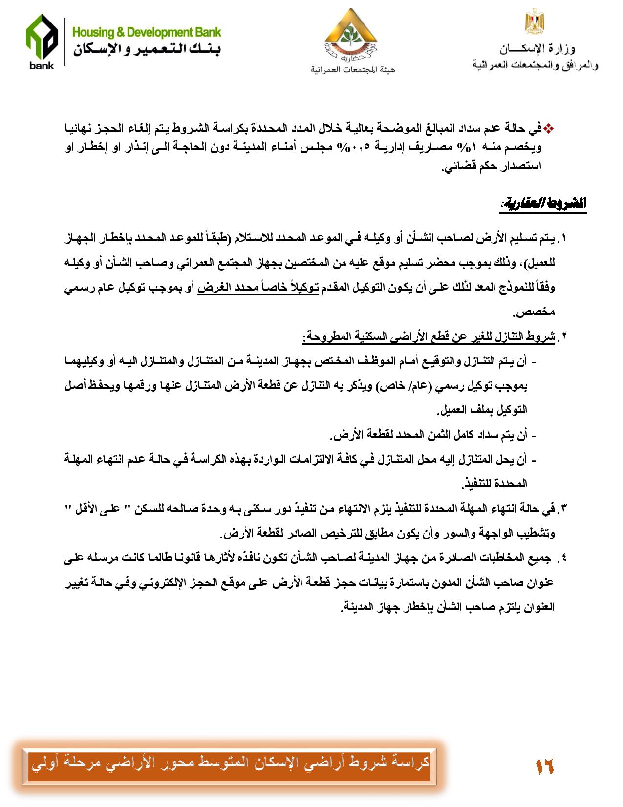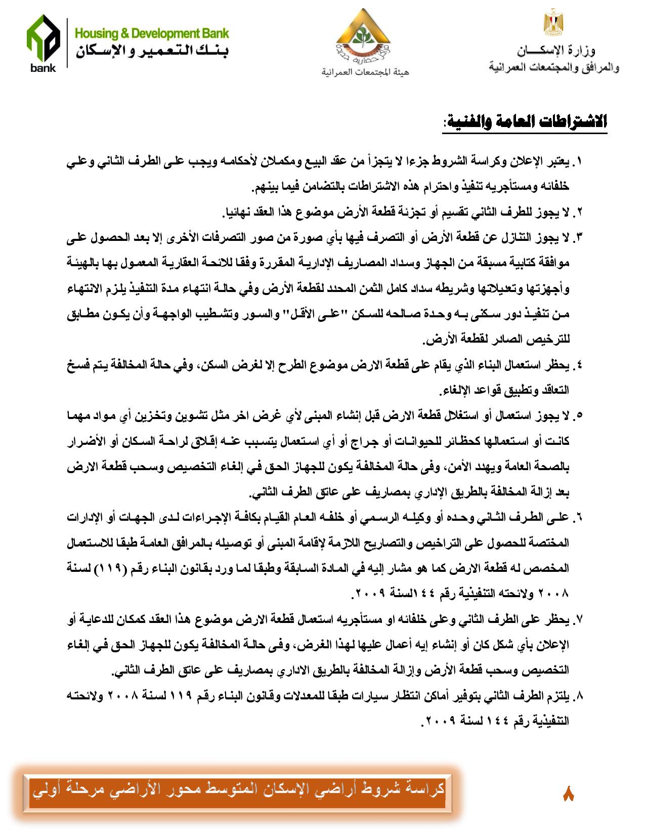 والتخصيص بنظام أسبقية الحجز (online)، طرح قطع أراضي الإسكان المتوسط "محور الأراضي" بعدد 1760 قطعة بمدن (المنيا الجديدة - سوهاج الجديدة - قنا الجديدة - الفيوم الجديدة - أخميم الجديدة - أسيوط الجديدة - بنى سويف الجديدة).
