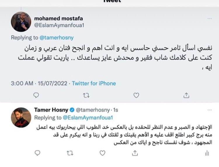 قام أحد المتابعين لدي تامر حسني عبر موقع "تويتر" بتوجيه سؤال له قائلًا: "نفسي أسأل تامر حسني حاسس بإيه وأنت أهم وأنجح فنان عربي وزمان كنت على كلامك شاب فقير وما حدش عايز يساعدك ياريت تقولي عملت إيه؟